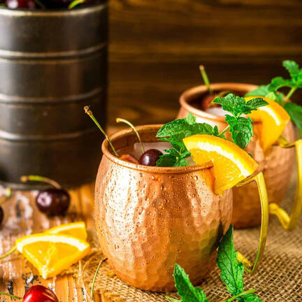 The classic Dravanian Mule is a citrus, fizzy delight served in a copper mug. This enjoyable cocktail consists of ice, lime juice, ginger beer, and vodka.